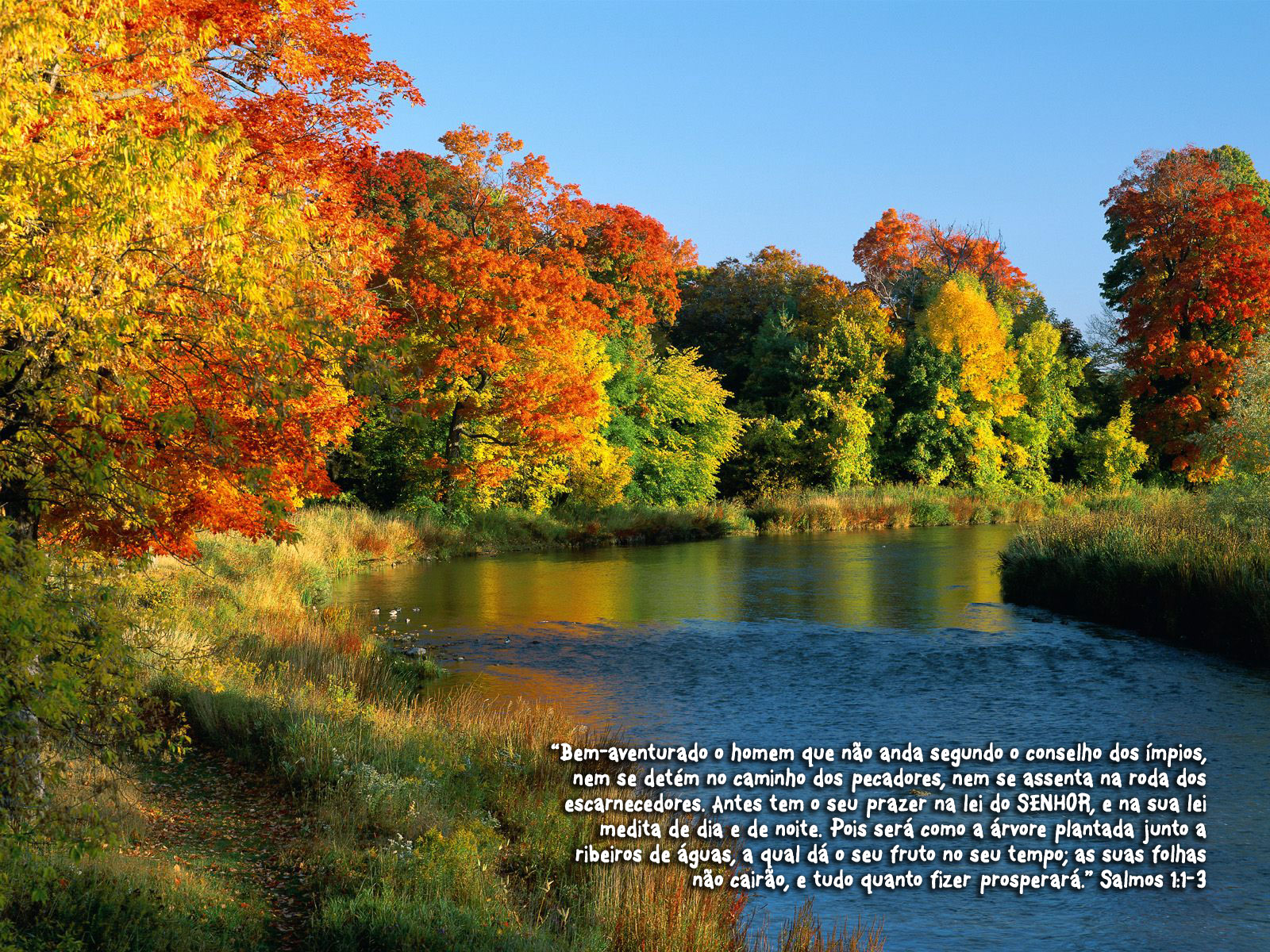 "Bem-aventurado o homem que não anda segundo o conselho dos ímpios, nem se detém no caminho dos pecadores, nem se assenta na roda dos escarnecedores. Antes tem o seu prazer na lei do SENHOR, e na sua lei medita de dia e de noite. Pois será como a árvore plantada junto a ribeiros de águas, a qual dá o seu fruto no seu tempo; as suas folhas não cairão, e tudo quanto fizer prosperará." Salmos 1:1-3